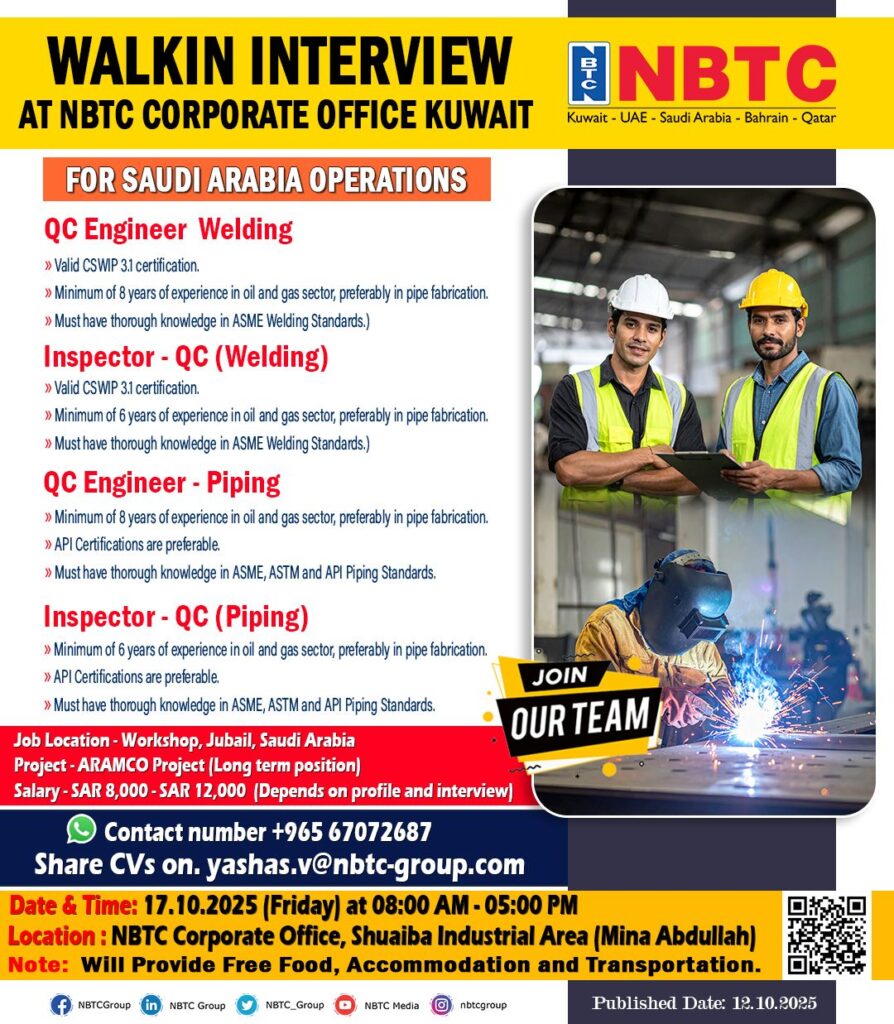 #NBTCGroup #Hiring #WalkInInterview#QCEngineer #QCInspector #WeldingJobs #PipingJobs #OilAndGas hashtag#ARAMCO hashtag#SaudiJobs hashtag#CareerOpportunity hashtag#Jubail hashtag#EngineeringJobs #NowHiring