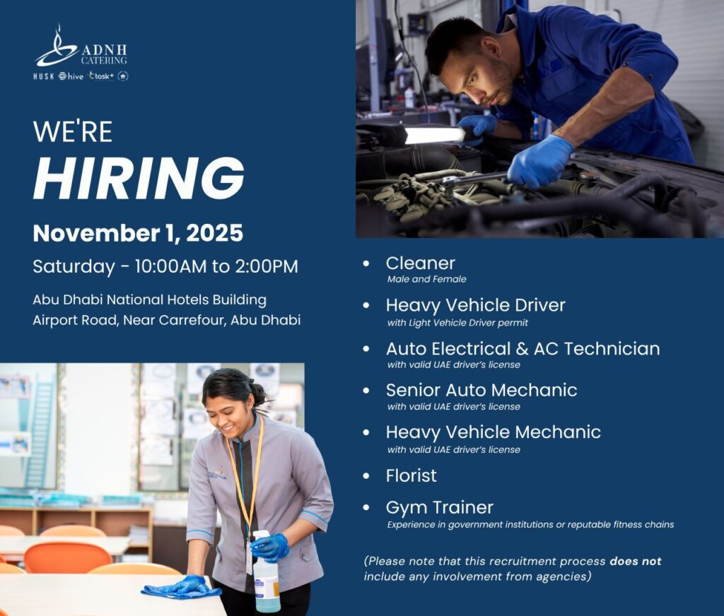 ADNH Catering is holding a recruitment open day on Saturday, November 1, 2025, from 10:00 AM to 2:00 PM in Abu Dhabi. The event is for various positions at the company. The company notes that this recruitment process does not involve any agencies.