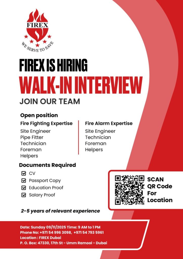 Based on the information provided, FIREX is holding a walk-in interview for several positions related to fire fighting and fire alarm systems.
