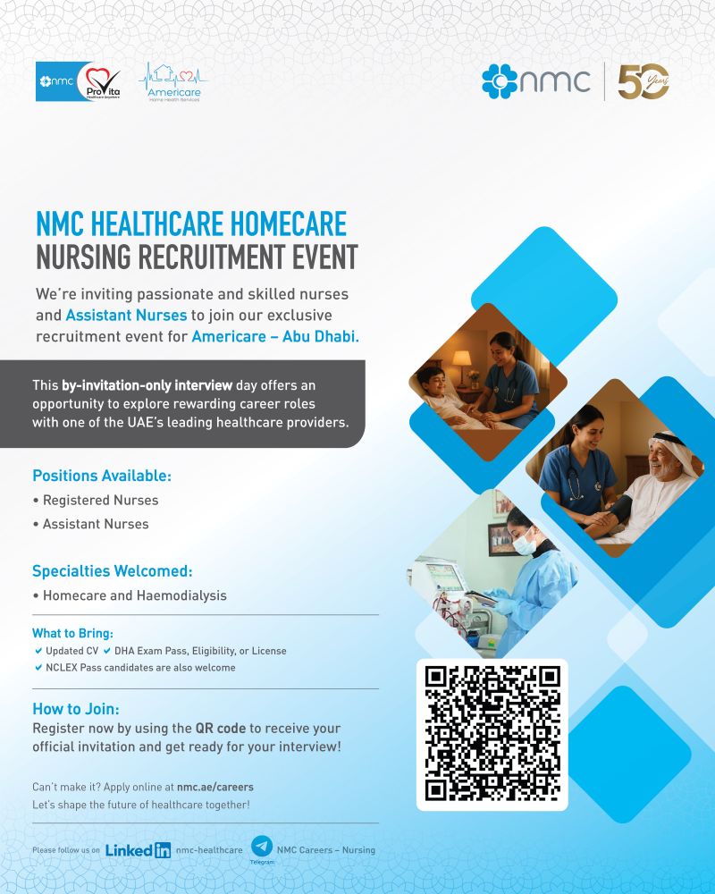 NMC Healthcare is actively recruiting for Registered Nurses and Assistant Nurses for Americare in the Abu Dhabi region through a series of by-invitation-only recruitment events. The image you provided is a LinkedIn post advertising one such event.