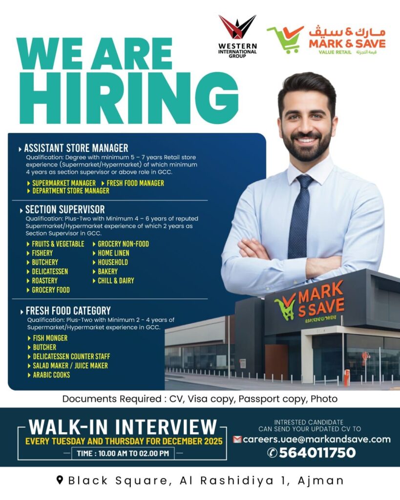 The walk-in interviews for Mark & Save in Ajman happen every Tuesday and Thursday for the month of December 2025, from 10:00 AM to 02:00 PM. The image you provided is an advertisement for these specific recruitment days.