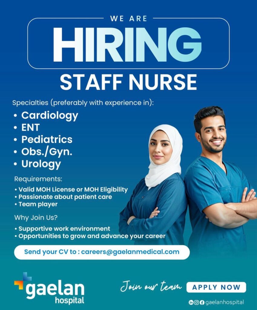 Gaelan Hospital is hiring staff nurses for their facility in Sharjah, United Arab Emirates. The positions require a valid MOH License or MOH Eligibility, a passion for patient care, and a team-player attitude.
