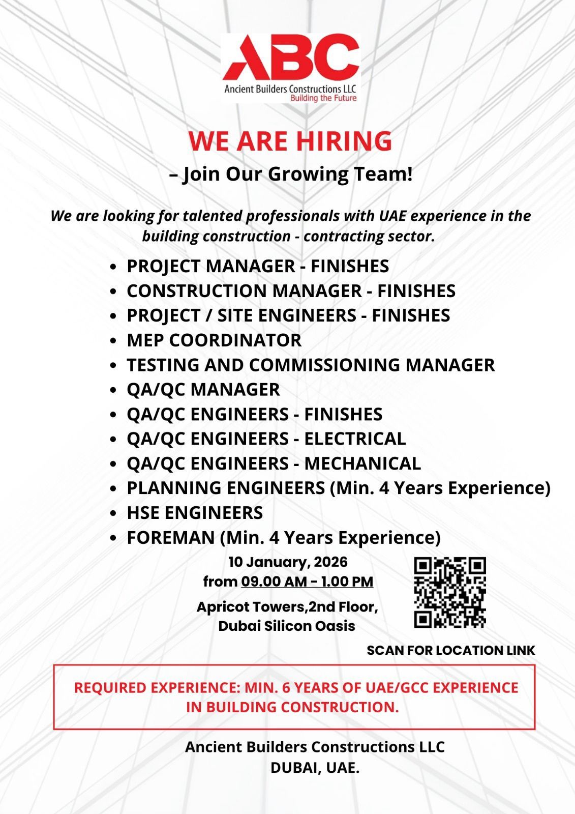 A strong emphasis is placed on quality, health, safety, and environmental compliance across all operations. Construction activities are carried out in accordance with UAE regulations, industry best practices, and approved safety standards. ABC maintains disciplined site management procedures to ensure safe working environments, minimize risks, and achieve consistent workmanship quality. Continuous monitoring and improvement processes support the company’s objective of delivering durable and compliant construction outcomes. ABC has developed the capacity to execute multiple projects simultaneously across various locations within Dubai and other parts of the UAE. The growing project portfolio reflects the company’s ability to adapt to diverse construction requirements, technical challenges, and client expectations. Ongoing investment in workforce development, training, and technical capability supports sustainable growth and operational efficiency. The company continues to strengthen its market presence by delivering projects that contribute to urban development and infrastructure expansion. The organization offers a professional and structured work environment that supports career development and long-term employment. Opportunities are regularly available for engineers, project management professionals, technical specialists, supervisors, and site personnel. ABC values skilled manpower and promotes a performance-driven culture that encourages accountability, teamwork, and professional growth.
