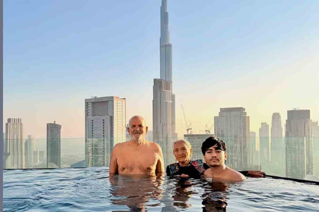 മുത്തശ്ശനെയും മുത്തശ്ശിയെയും കൂട്ടി ദുബായ് ഇൻഫിനിറ്റി പൂളിലേക്ക്, കാഴ്ചക്കാരുടെ ഹൃദയം കവർന്ന് ഇന്ത്യക്കാരനായ കൗമാരക്കാരൻ