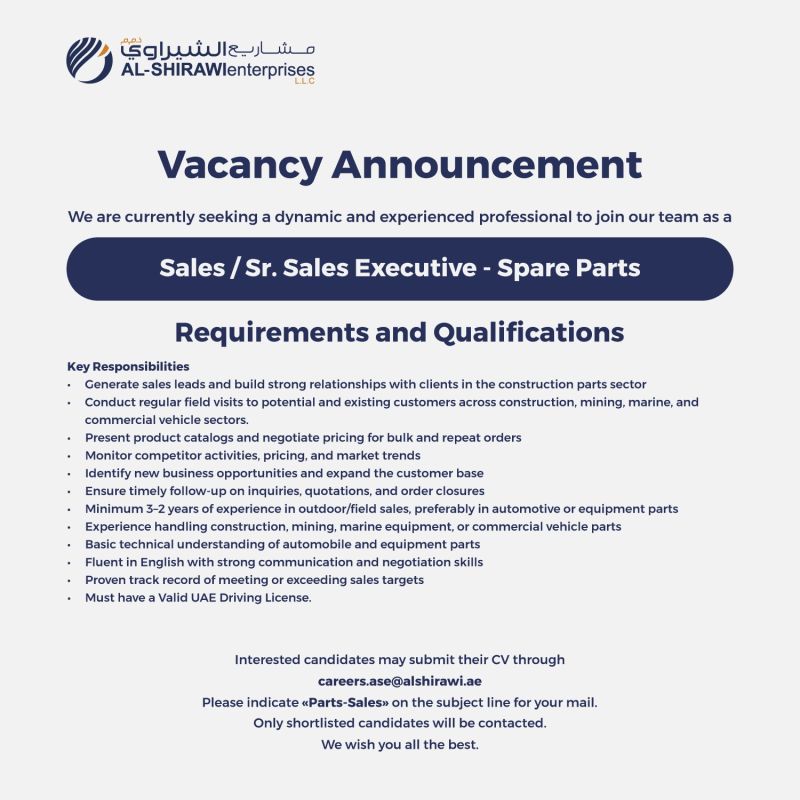 Interested candidates are invited to submit their resume and cover letter for the Sales / Senior Sales Executive – Spare Parts position using “Parts-Sales” as the email subject line. Applications should clearly outline relevant field sales experience, technical knowledge of automotive or industrial equipment parts, and evidence of achieving or surpassing sales goals. Working with Al Shirawi Enterprises offers exposure to a wide range of commercial vehicles and industrial solutions, opportunities for professional development, and a chance to contribute to a company recognized for reliability, innovation, and industry leadership. For additional information about Al Shirawi Enterprises LLC, its brands, and services. This opportunity is ideal for ambitious sales professionals seeking to advance their careers in a dynamic, high-growth environment, offering direct engagement with clients, hands-on experience with world-class equipment, and the ability to make a measurable impact in multiple industries. The role provides a balance of field-based sales responsibilities and strategic business development tasks, ensuring continuous learning and growth. Al Shirawi Enterprises values individuals who are motivated, self-driven, and committed to delivering exceptional service and achieving results. By joining the team, candidates will become part of a legacy of trust and excellence, working alongside experts in commercial vehicles, construction and agriculture equipment, waste management solutions, and industrial storage systems. The position also provides an opportunity to gain market insights, develop strong client networks, and contribute to expanding the company’s presence across the UAE. Overall, this Sales / Senior Sales Executive – Spare Parts role offers a challenging and rewarding career path for professionals who are passionate about sales, committed to customer satisfaction, and eager to grow within a leading industrial solutions provider.