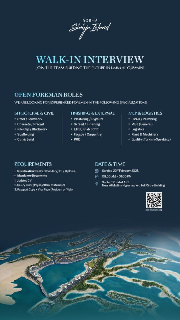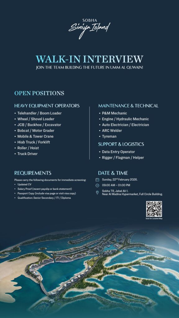 Sobha Siniya Island is hosting a walk-in interview event on Sunday, February 22, 2026. The recruitment drive is for various positions in heavy equipment operation, maintenance, and support for their project in Umm Al Quwain.